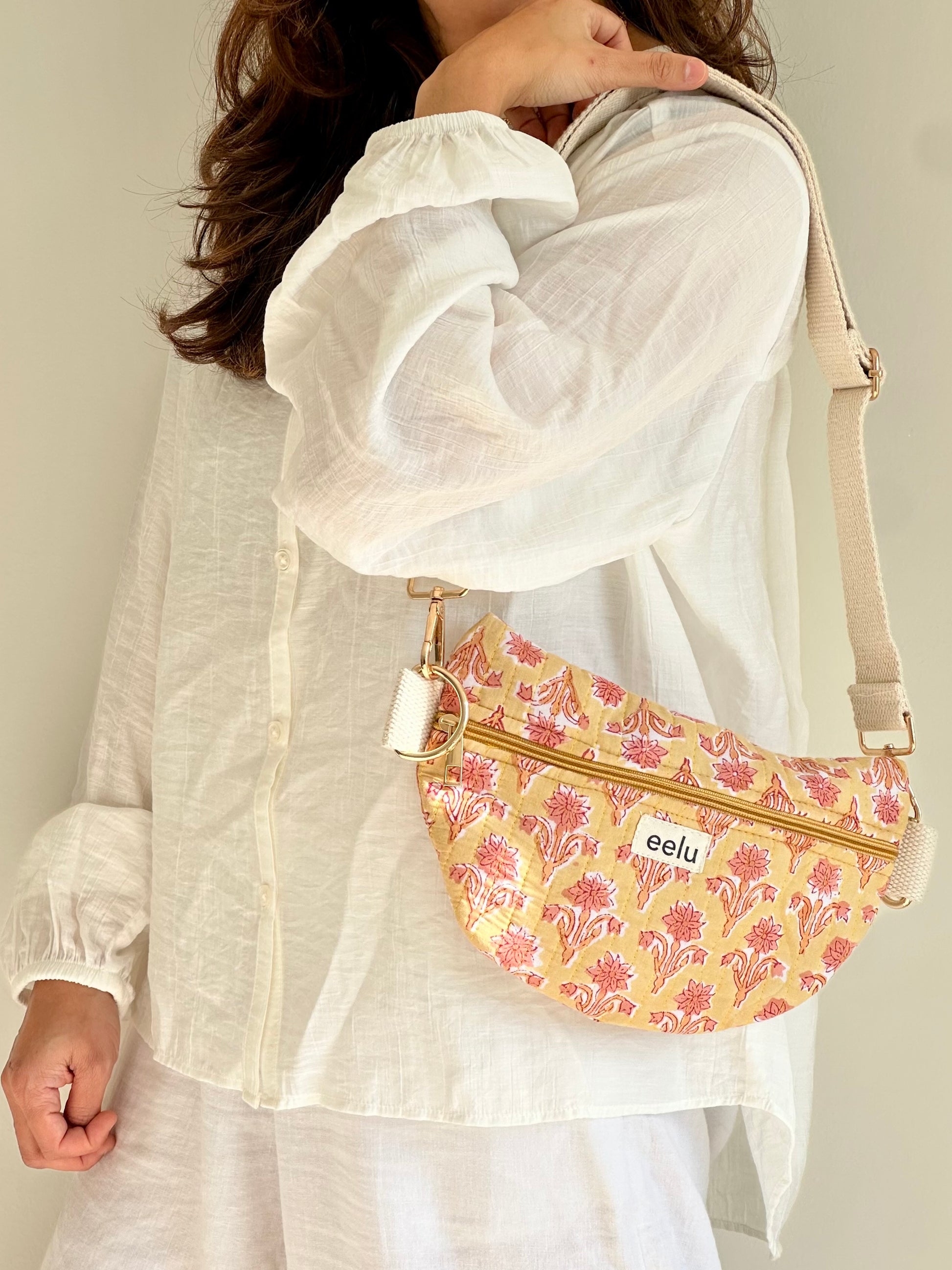 The Surya Crossbody Bag shines in hand-block printed yellow cotton fabric, scattered with playful pink florals. Softly quilted and handmade with care, it’s light, hands-free, and designed to carry a little sunshine with you.