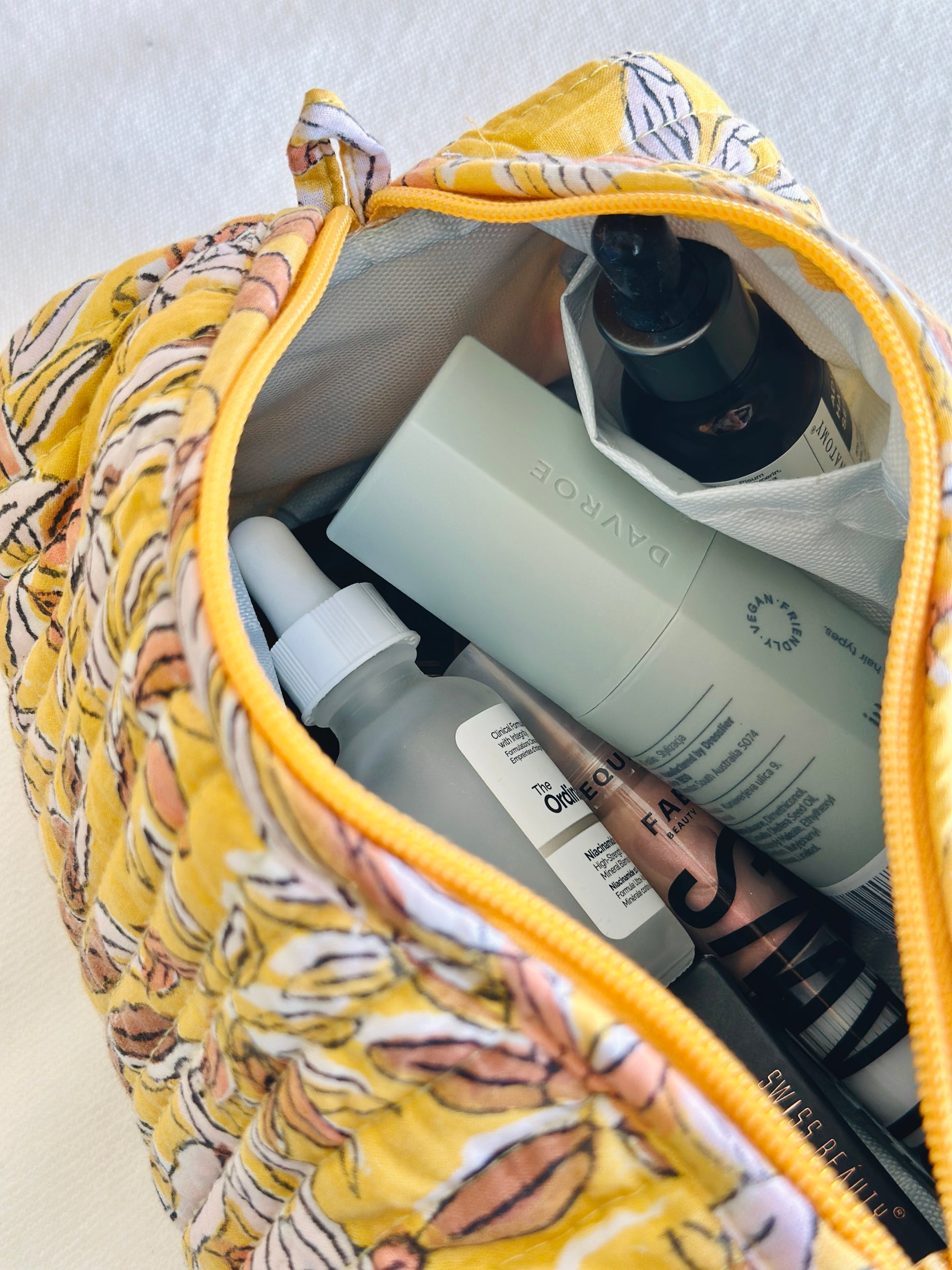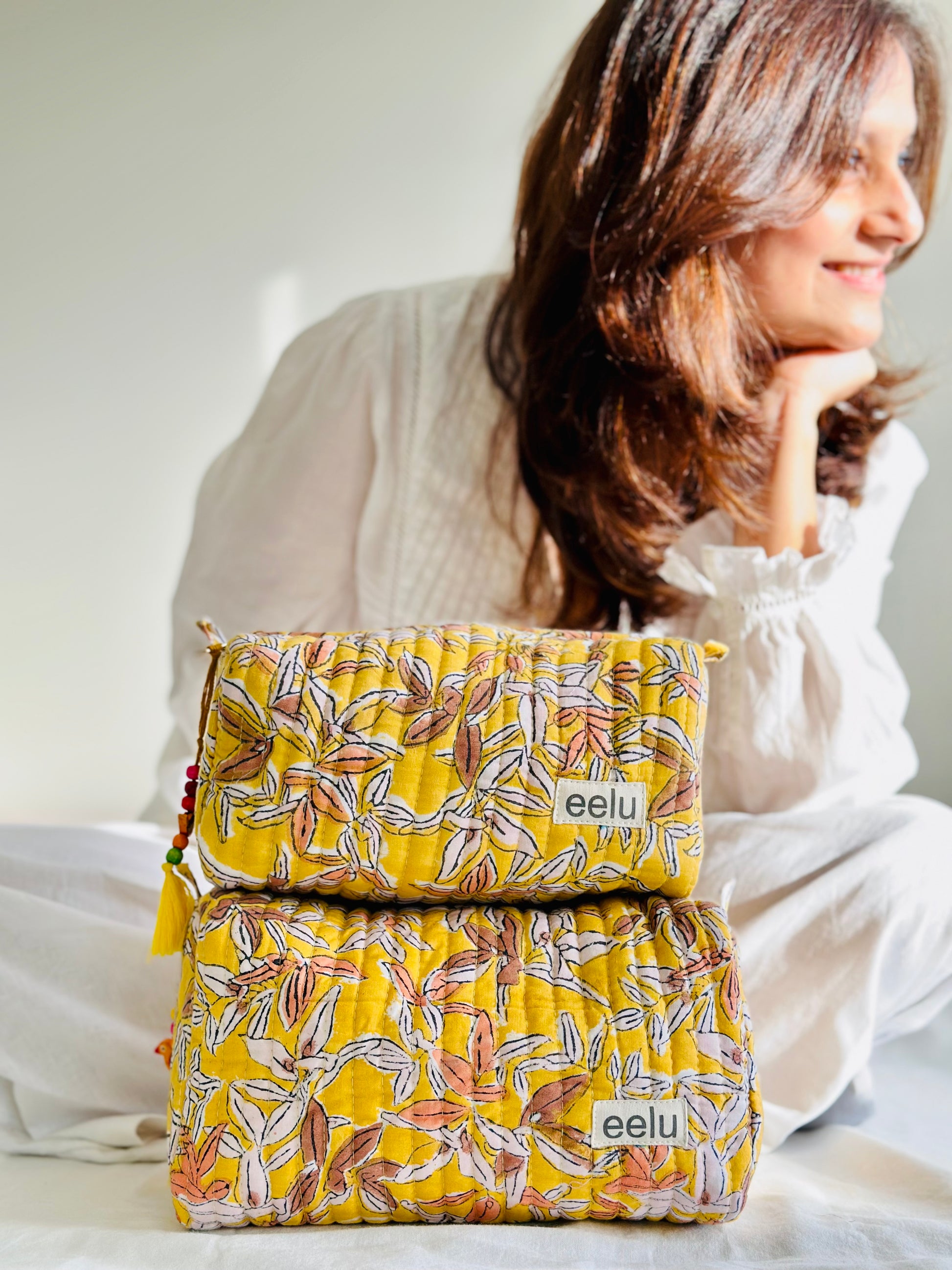 Mukhi Makeup Bag is made from a radiant yellow hand-printed fabric, with delicate motifs that feel like tiny sunbursts across a soft cotton sky. There’s something about this print that feels uplifting — warm, cheerful, and quietly full of hope. It’s a fabric that carries lightness, like early morning sunlight peeking through, making it perfect for days when you want to feel both grounded and gently energised.