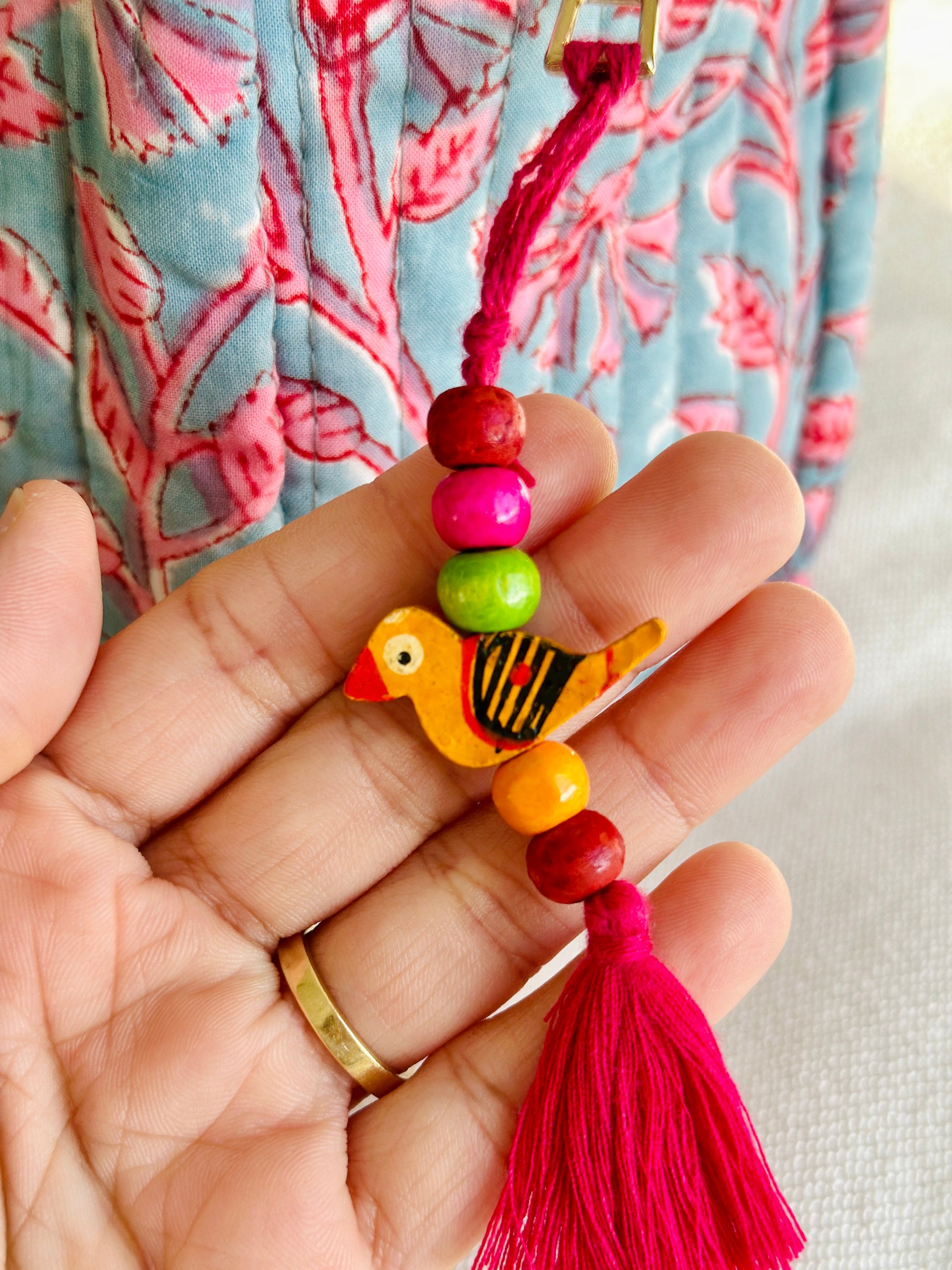 Siya Makeup Bag features a soft powdery grey blue base wrapped in vivid pink hand-block printed vines. The delicate floral design feels wild yet graceful — like a garden dancing in the breeze. Bright and breezy, this pouch carries a spark of playfulness.